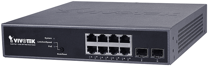 Vivotek Web Smart Managed 10 port switch, 8 Gb PoE, 2 Gb SFP Ports, PoE BUDGET 130W