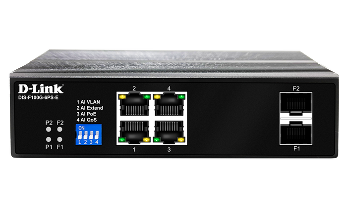 DLINK 6-Port Gigabit Industrial PoE Switch with 4 1000BASE-T Long Reach PoE+ ports and 2 SFP ports. PoE budget 120W