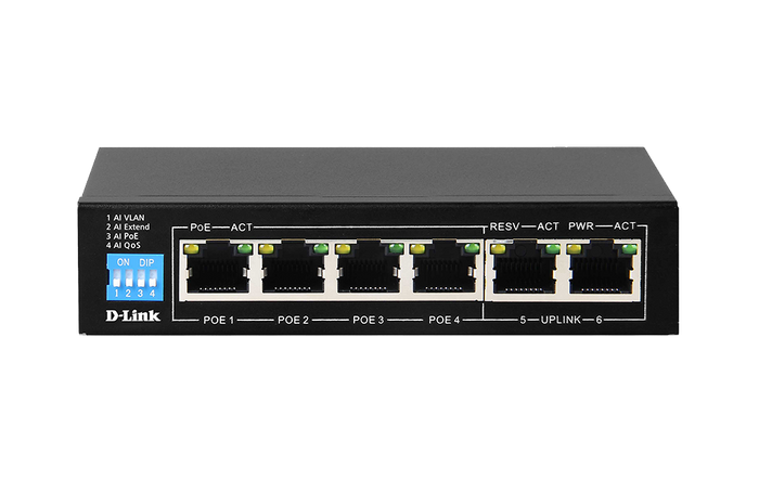 DLINK 6-Port Gigabit PoE Switch with 4 Long Reach PoE Ports and 2 Uplink Ports. PoE budget 60W.