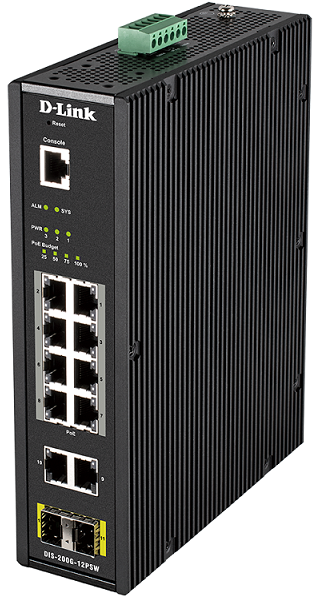 DLINK 12-Port Gigabit Industrial Smart Managed PoE Switch with 10 1000BASE-T (8 PoE+) ports and 2 SFP ports, operating temp up to 75?C, DIN Rail mountable
