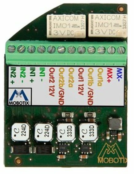 Expansion module for Indoor Cameras c26A/B, i26A/B, p26A/B and v26A/B (installed on the back).Not suitable for x25 indoor cameras.For connecting external sensors (e.g., door and window contacts) and switches of external devices (e.g., relays with lamps and motors).Two inputs (galvanically separated): 0 degreeV to 48 degreeV degreeAC/DC.Two outputs: 2x floating (load per contact max. 30 degreeW or 1 degreeA or 48 degreeV AC/DC) or 2x 12 degreeV degreeDC (max. 50 degreemA per output).2x MxBus terminal connector (MxBus will be supported only by the x26B Indoor Cameras).Ambient temperature: 0 degreeC to 40 degreeC (32 degreeF to 104 degreeF).Power consumption: 1 degreeW