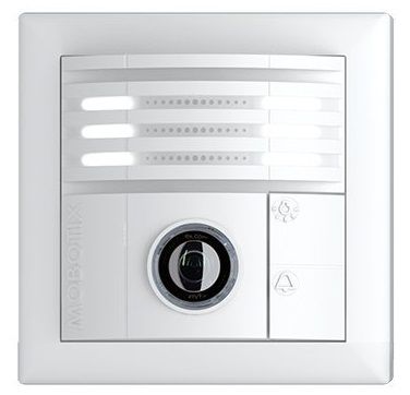 Hemispheric IP door station camera with.Megapixel Moonlight Sensor, color (day).ONVIF.compliant Mx6 system platform (2nd generation) with H.264, MxPEG+ and M-JPEG.HD premium fisheye lens B016 (focal length 1.6 mm, f/2.0, 180 degree.180 degree).Max. image size: 6MP (3072.2048).IP65, -30 to 50 degreeC (-22 to 122 degreeF).Internal DVR:.GB microSD.LED lighting strips, two buttons (doorbell, outdoor light), temperature sensor, shock.detector, MxActivitySensor, MxAnalytics, ethernet patch cable 0.5 m/1.6 ft.Interfaces: Ethernet 10/100 (RJ45 and LSA), MxBus, USB.Color: White