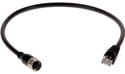 M12 D-Code 4-pin (Female) to RJ45 (Male) Ethernet cable, CAT5E. Length: 0.5m (1.6ft). Cable outer diameter: 6.2mm (0.25"). Color: Black. Outdoor UV and sunlight resistant. Tested operational for shock and vibration according to requirements for rolling stock and ground vehicle installations. Compatible with all Axis network video products with female RJ45 Ethernet port 802.3af and 802.3at (up to 30W).