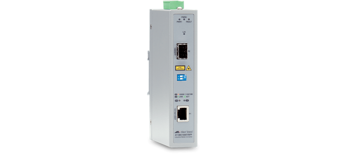 Allied Telesis 2-port Gigabit Ethernet PoE+ Industrial Media Converter, 10/100/1000T PoE+ to 100/1000X SFP, DC power supplies.