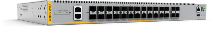 Allied Telesis 24-port 100/1000X SFP stackable L3 switch with 4 SFP+ ports and 2 fixed power supplies, DC power supplies. Requires purchase of Net.Cover for Support and Software Updates.